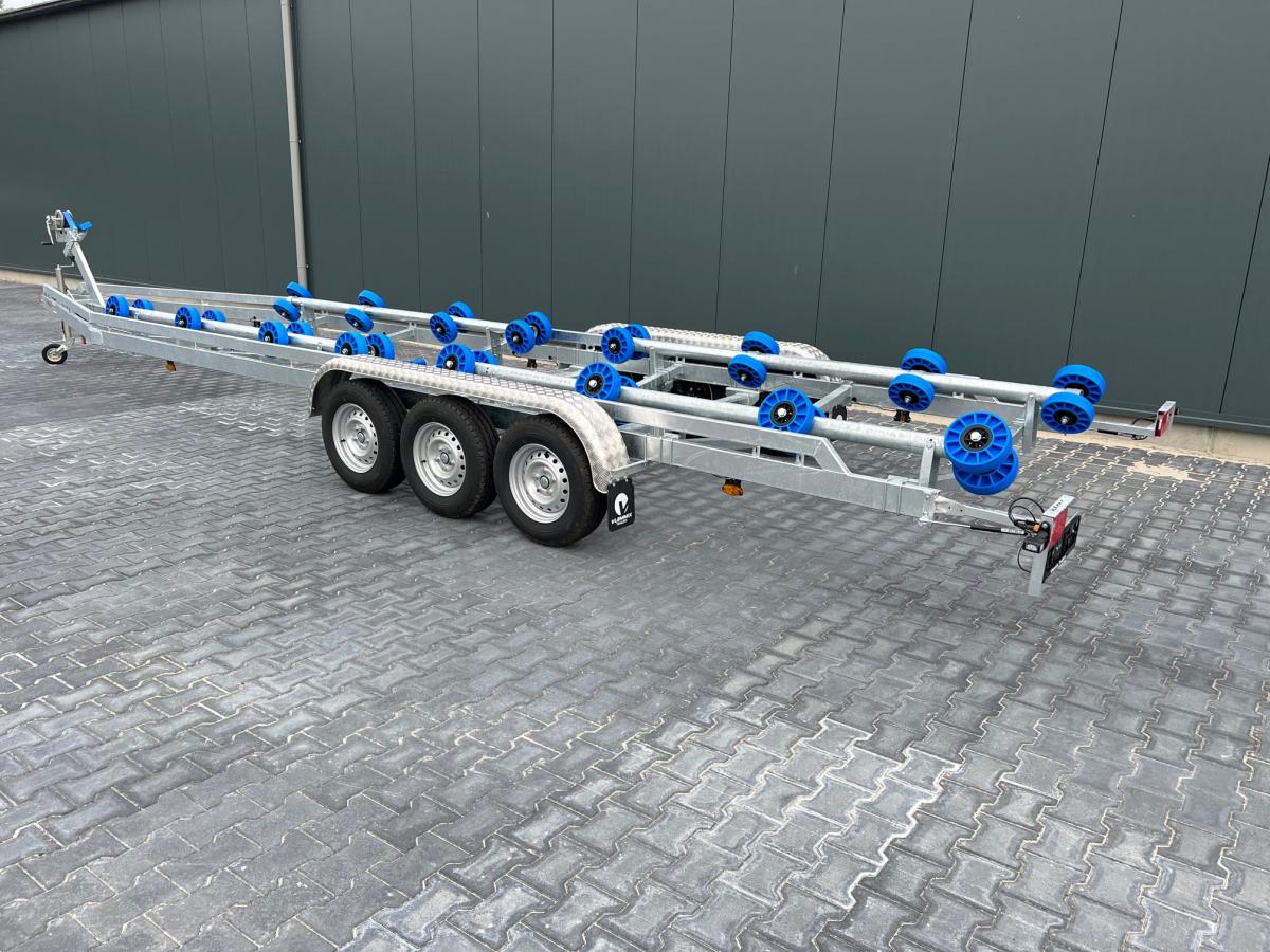 Op alle boottrailers van Vlemmix Trailers zijn Knott assen met waterdichte lagers gemonteerd. En natuurlijk RVS remkabels en een RVS draadstang voor het remsysteem.De bekabeling zit verwerkt in het frame en wordt met een 13-polige stekker aan de contactdoos van uw auto aangesloten. De boottrailer 10.00 mtr. 3 ×1800 kg assen beschikt tevens over waterdichte LED contourverlichting en LED kentekenverlichting.